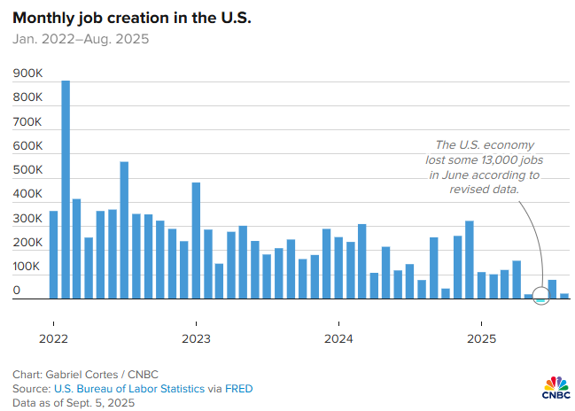- Američko tržište rada se s druge strane hladi. U kolovozu je broj novootvorenih radnih mjesta iznosio tek 22 tisuće (očekivanja su bila da će biti 75 tisuća), dok je stopa nezaposlenosti blago porasla na 4,3%. Nova revidiranja za prošle mjesece pokazala su da je u lipnju čak došlo do pada novostvorenih radnih mjesta za 13 tisuća. Kako god, u zadnja 4 mjeseca je neto zapošljavanje gotovo stalo, a takvo slabljenje tržišta rada je ne samo „zacementiralo“ vjerojatnost spuštanja kamatnih stopa na sljedećem FOMC sastanku, već počinju rasti očekivanja da bi umjesto 25 baznih bodova rezanje moglo biti za 50 baznih bodova ili pola postotna boda.
