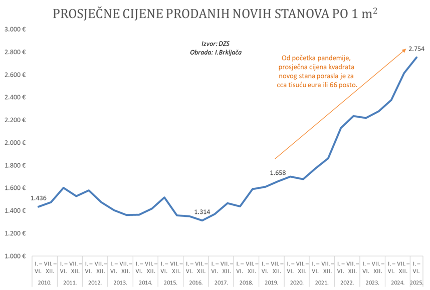 - Cijene novih stanova i dalje snažno rastu. U prvom polugodištu 2025. prosječna cijena kvadrata novog stana u Hrvatskoj iznosila je 2.766 eura (bez POS-a), što je porast od 4,3% u odnosu na drugo polugodište 2024. te 11,8% u odnosu na isto razdoblje prethodne godine. U Zagrebu je prosječna cijena iznosila 2.964 eura, a u ostatku Hrvatske 2.528 eura. Ukupno je prodano 2.086 novih stanova (od čega čak 1.205 u Zagrebu) s prosječnom površinom stana od 67 m². Na priloženoj slici možemo vidjeti kako su od kraja 2019. cijene novih stanova porasle za oko 66%, dok su se u zadnjih deset godina otprilike – udvostručile.