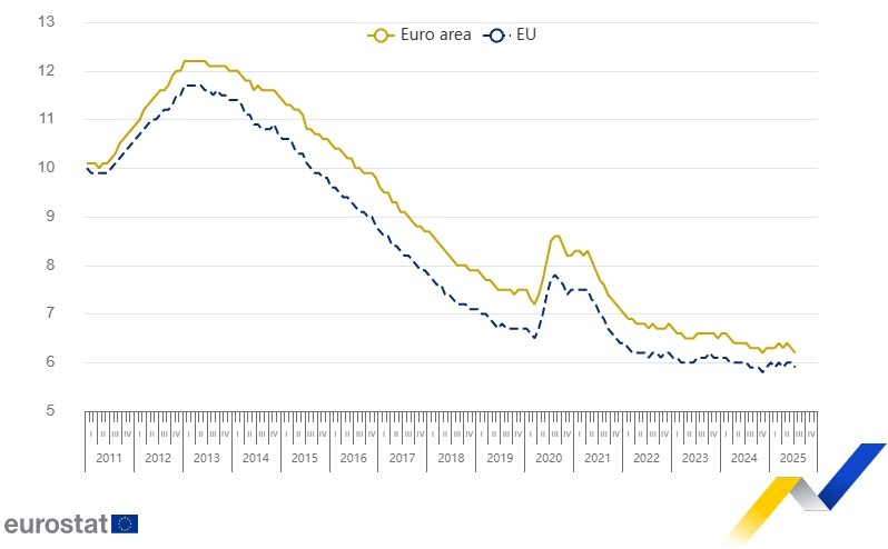 - Europsko tržište rada i dalje je u jako dobrom stanju, sa stopom nezaposlenosti blizu povijesno niskih razina. U srpnju je sezonski prilagođena stopa nezaposlenosti u europodručju iznosila 6,2%, što je smanjenje u odnosu na 6,3% u lipnju 2025. i 6,4% u srpnju 2024. Stopa nezaposlenosti u EU-u iznosila je 5,9% u srpnju 2025., što je također smanjenje u odnosu na 6,0% u lipnju 2025. i 6,0% u srpnju 2024.