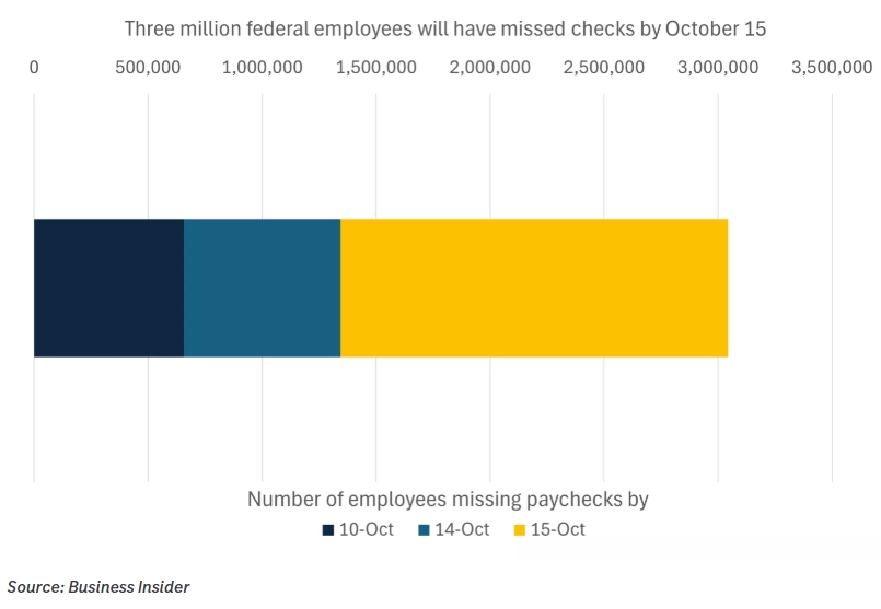 - Američki shutdown se nastavlja, a na vidiku dogovora između republikanaca i demokrata nema. Ovo je već sada 4. najduži shutdown u američkoj povijesti, a da će potrajati i dulje od 15. listopada, vjerojatnost je veća od 95% prema Polymarketu. Razlog zašto spominjem taj datum je što američki vojnici tada dobivaju plaću, a govorimo o gotovo dva milijuna ljudi. Do sada je 650 tisuća federalnih zaposlenika ostalo bez plaće (svakim je danom njihov broj sve veći), a za nekoliko dana bit će riječ o preko 3 milijuna ljudi.