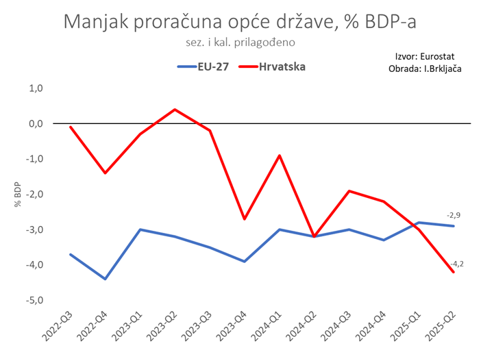 - No, da se stanje javnih financija kvari po pitanju manjka proračuna, potvrdili su novi podaci Eurostata. Hrvatski manjak proračuna opće države snažno se pogoršao u zadnje tri godine. Štoviše, u drugom tromjesečju 2025. sezonski i kalendarski prilagođeni proračunski manjak opće države iznosio je neprihvatljivo visokih 4,2 posto BDP-a. Namjerno kažem „neprihvatljivo visokih“ jer zbilja nije bilo razloga da u uvjetima relativno snažnog gospodarskog rasta ovako pokvarimo i preokrenemo trend. Na priloženoj slici vidimo usporedno kretanje proračunskih manjkova u Hrvatskoj i EU u zadnje tri godine. Unatoč krajnje anemičnom gospodarskom rastu, u EU je trend blago pozitivan po pitanju deficita te je uspio doći na ispod 3% BDP-a. Hrvatska je pak od odličnog đaka, i unatoč jednom od najviših stopa rasta BDP-a, produbila rupu u proračunu na 4,2% BDP-a.