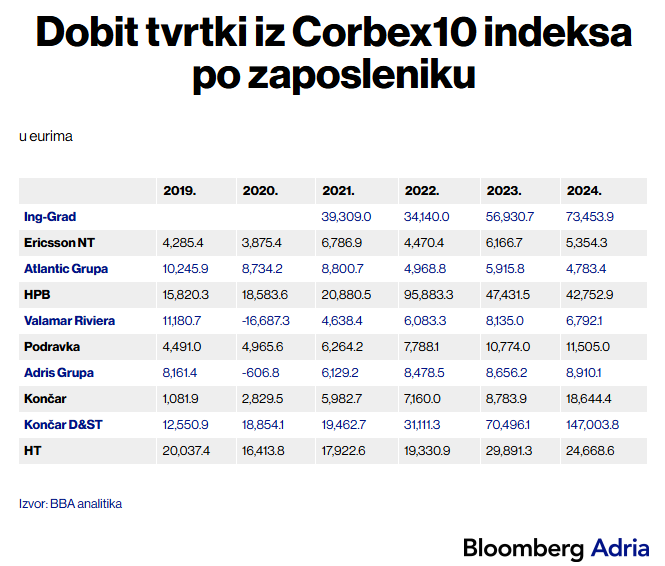 - Analitičari Bloomberg Adrije pozabavili su se kompanijama iz sastava CROBEX10 odnosno njihovim rastom dobiti u zadnjih 5 godina te kretanju dobiti po zaposleniku. Tako su kompanije u sastavu CROBEX10 u 2019. ostvarile dobit od 319,7 milijuna eura, dok su lani zajednički zabilježile dobit od 642,8 milijuna. Dakle, više nego dvostruko povećanje u pet godina, što daje složenu godišnju stopu rasta (CAGR) od oko 15 posto. Nisu sve kompanije rasle istim tempom, dakako, niti im je odnos dobiti po radniku ujednačen. Štoviše, razlike su velike: na čelu je uvjerljivo KONČAR D&ST s impresivnih 147 tisuća eura dobiti po zaposlenom, dok je na začelju Atlantic Grupa kojoj je godišnja dobit pala na ispod 5 tisuća eura po zaposlenom. Sve kompanije povećale su broj zaposlenih, osim Ericssona Nikole Tesle (koji je srezao njihov broj s 3200 na 2900) i Podravke (koja je sa 6.650 došla na 6.420). Više pročitajte u spomenutoj analizi.