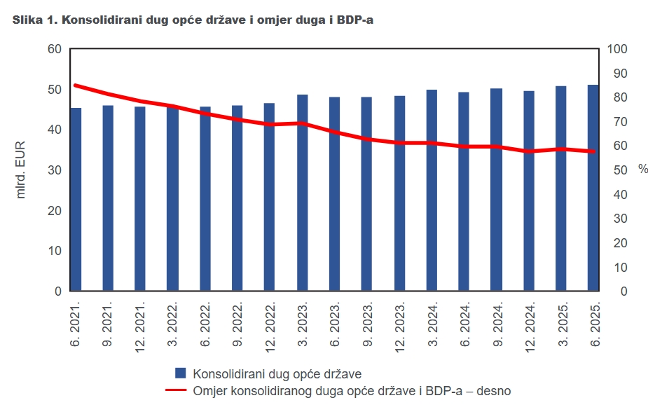- Javni dug na kraju ovogodišnjeg lipnja iznosio je 51 milijardu eura, što je za 1,8 milijardi ili 3,7 posto više nego u odnosu na kraju lipnja 2024., objavila je Hrvatska narodna banka (HNB). Promatrano u odnosu na godišnji BDP (izračunat kao zbroj prethodna četiri tromjesečna BDP-a), ukupni dug na kraju lipnja iznosio je 57,5% BDP-a, dok je na kraju lipnja prošle godine taj omjer iznosio 59,3%. Smanjenje udjela javnog duga u BDP-u rezultat je brže stope rasta nominalnog BDP-a od nominalnog rasta duga.