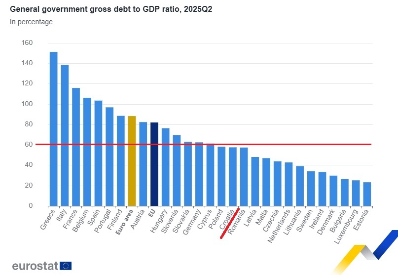 - Eurostat je objavio podatke o visini javnoga duga na kraju drugog tromjesečja 2025. po državama članicama. Najviši omjeri javnoga duga i BDP-a na kraju drugog tromjesečja 2025. zabilježeni su u Grčkoj (151,2%), Italiji (138,3%), Francuskoj (115,8%), Belgiji (106,2%) i Španjolskoj (103,4%), a najniži omjeri zabilježeni su u Estoniji (23,2%), Luksemburgu (25,1%), Bugarskoj (26,3%) i Danskoj (29,7%). Na priloženoj slici vidimo kako samo polovica EU zemalja zadovoljava famozni kriterij iz Maastrichta (60 posto BDP-a), a Hrvatska se od prošle godine opet nalazi u skupini uzornih zemalja po ovome kriteriju.