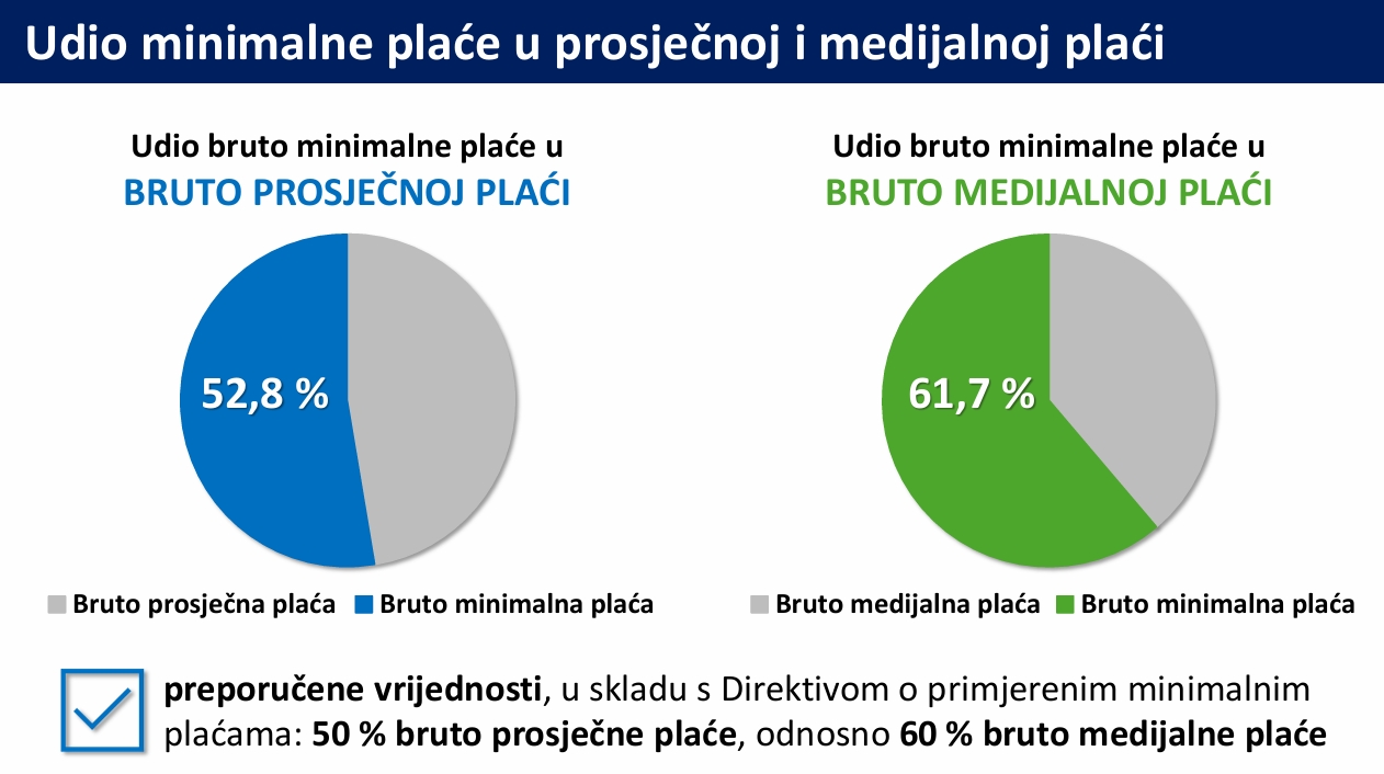 - Vlada RH je najavila kako će iznos minimalne bruto plaće za 2026. iznositi 1.050 eura, što je oko 8,25 posto više u odnosu na 2025. I dok su poslodavci tražili da se za 2026. ne diže minimalac, sindikati su tražili povećanje od 16,5 posto. Sredina između 0 posto i 16,5 posto je, pogađate, 8,25 posto (Da se nađemo na pola puta). Udio minimalne plaće u prosječnoj i medijalnoj tako će nastaviti rasti, iako smo već premašili preporučeni udio prema europskoj direktivi o primjerenim minimalnim plaćama (vidi priloženo sliku). Očito želimo biti veći katolici i od pape, ali dobro. Kažimo i da se podizanjem minimalca automatizmom utječe i na studentsku satnicu, tako da će ona sa sadašnjih 6,06 eura porasti na 6,56 eura.
