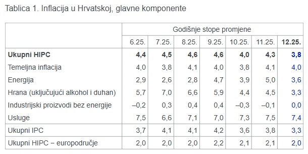 - Ukupna inflacija u Hrvatskoj mjerena harmoniziranim indeksom potrošačkih cijena (HIPC) prema prvoj se procjeni u prosincu 2025. usporila na 3,8%, s 4,3% u studenom. Rezultat je to ponajviše usporavanja inflacije cijena hrane i energije. Pritom se temeljna inflacija (koja isključuje cijene energije i hrane) u prosincu tek blago usporila na 4,0%, s 4,1% koliko je iznosila u studenom. Inflacija mjerena nacionalnim indeksom potrošačkih cijena (IPC), koji odražava strukturu potrošnje hrvatskih građana, u prosincu se usporila na 3,3%, s 3,8% u studenom. Razlika između HIPC inflacije u Hrvatskoj i prosjeka europodručja u prosincu se smanjila na 1,8 postotnih bodova, s 2,2 postotna boda u studenom. Hrvatska se tako više ne nalazi na samom vrhu zemalja europodručja po visini inflacije, odnosno pala je na četvrto mjesto poretka (Estonija, Austrija i Slovačku bilježe višu stopu inflacije).