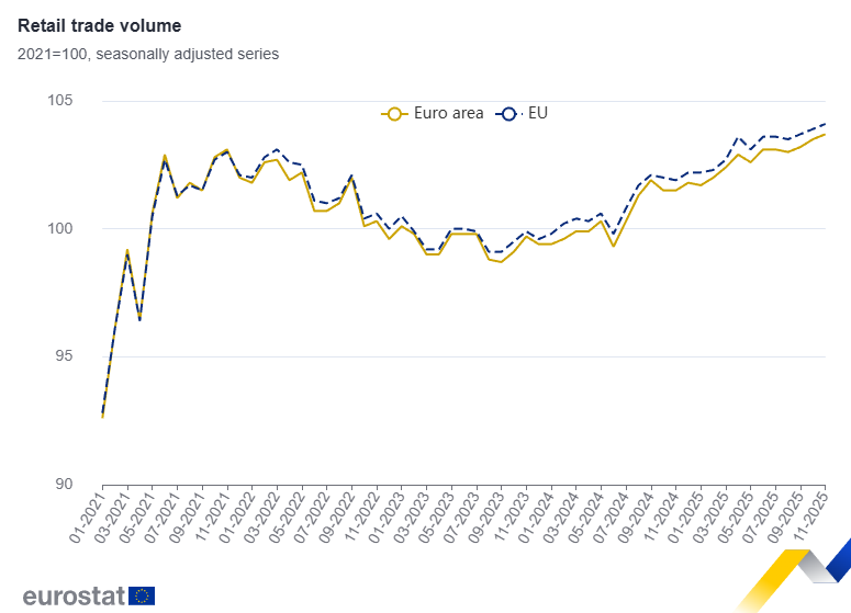 - Potrošnja u maloprodaji u zemljama EU nastavlja se oporavljati. U studenom 2025., u usporedbi s listopadom 2025., sezonski prilagođeni maloprodajni promet porastao je za 0,2% i u europodručju i u EU-u, dok je u odnosu na isti mjesec lani realni rast iznosio 2,3%. Na priloženoj slici možemo vidjeti kako je realna potrošnja u maloprodaji bila u silaznom trendu gotovo dvije godine (cijelu 2022. i veći dio 2023.), a što je bila izravna posljedica visoke inflacije. Kada se inflacija primirila, realna potrošnja ponovno je počela rasti i sada se već nekoliko mjeseci bilježe novi rekordi realne potrošnje u europskoj maloprodaji.