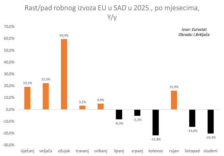 - A što je se točno dogodilo s robnom razmjenom između EU i SAD-a? Možda iznenađujuće, no izvoz EU u SAD je u prvih 11 mjeseci 2025. – porastao! I to za 4,7 posto, dok je uvoz porastao za 4,9% (napomena: radi se o vrijednostima iskazanima u eurima; rast iskazan u dolarima, kako to računa američka strana, pokazuje dvoznamenkaste stope rasta i uvoza i izvoza jer tečaj dolara oslabio tijekom prošle godine). Suficit robne razmjene EU s SAD-om se tako povećao za 4,2% u 2025., što je razmjerno iznenađujući rezultat na prvu. Ipak, to ne znači da carine nisu imale efekta na međusobnu razmjenu, dapače. Pogledajmo kako se kretao robni izvoz EU u SAD po mjesecima u 2025. u usporedbi s istim mjesecima 2024. Na slici vidimo kako je u prva tri mjeseca 2025. došlo do velikog skoka EU izvoza, naročito u ožujku (+59,4% Y/y). Neposredni uzrok takvog skoka izvoza su Trumpove najave povećanja carina koje je uslijedilo u travnju, što znači da je došlo do tzv. front loadinga (pomicanje narudžbi unaprijed prije stupanja carina na snagu). Liberation day, pa onda najava o 90 dana pauze, u međuvremenu uvođenje sektorskih carina itd. izazvali su velike oscilacije u robnoj razmjeni, no generalni trend je ipak bio pad EU izvoza u SAD u ostatku godine. Jedini mjesec u drugoj polovici godine u kojoj je došlo do rasta izvoza je bio rujan, što je bila posljedica konačnog stupanja na snagu dogovora između EU i SAD o 15-postotnim carinama. Iako razmjerno nepovoljan za EU, dogovor je barem otklonio neizvjesnost pa je došlo do privremenog rasta izvoza. U listopadu i studenom ponovno vidimo veliki pad izvoza, što sugerira da carine ipak značajnije štete europskom izvozu i da će se njihov puni efekt tek vidjeti.
