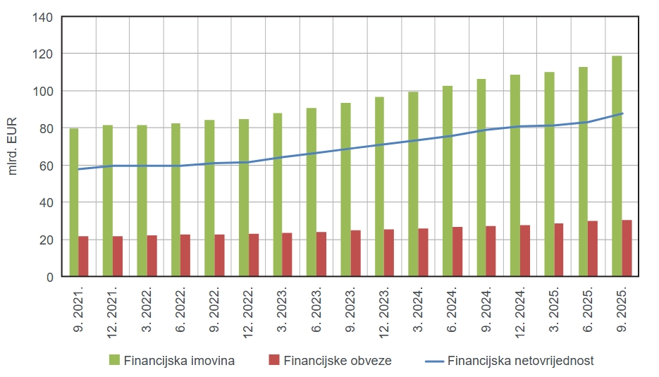 - Financijska imovina hrvatskih kućanstava i dalje raste, pokazuju novi podaci HNB-a. Na kraju trećeg tromjesečja 2025., ukupna financijska imovina kućanstava iznosila je 118 mlrd. EUR ili 5,0% više nego na kraju prethodnog tromjesečja, a u razdoblju od godine dana porasla je za preko 12 mlrd. EUR ili 11,6%. Samo u kešu (gotovini i depozitima) kućanstva drže preko 50 milijardi eura. Istovremeno su se financijske obveze kućanstava povećale na 31 mlrd. EUR, što je porast od 2,3% u odnosu na kraj prethodnog tromjesečja, odnosno za 12,0% u odnosu na isto tromjesečje 2024. Takva kretanja rezultirala su povećanjem financijske neto vrijednosti sektora kućanstava na gotovo 88 mlrd. EUR ili 6,0% više nego na kraju prethodnog tromjesečja, odnosno za 9 mlrd. EUR ili 11,4% više u odnosu na kraj istog tromjesečja prethodne godine. Na priloženoj slici možemo vidjeti kako su hrvatska kućanstva u samo tri godine povećala svoju financijsku netovrijednost (financijska imovina umanjena za obveze) za oko 44 posto u nominalnom iznosu (u realnim terminima porast je, dakako, manji, ali svejedno značajan). Financijska neto vrijednost hrvatskih kućanstava tako je narasla na cca 100% hrvatskog godišnjeg BDP-a.