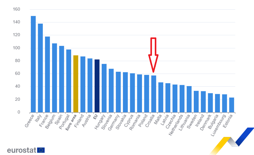 - Na kraju trećeg tromjesečja 2025. javni dug zemalja europodručja iznosio je 88,5% BDP-a, a svih zemalja EU 82,1%, objavio je Eurostat. To je blagi porast u odnosu na prethodno tromjesečje, kao i u odnosu na isto tromjesečje 2024. Najviši omjeri javnog duga i BDP-u trenutačno su u Grčkoj (149,7%), Italiji (137,8%), Francuskoj (117,7%), Belgiji (107,1%) i Španjolskoj (103,2%), a najniži u Estoniji (22,9%), Luksemburgu (27,9%), Bugarskoj (28,4%) i Danskoj (29,7%). Hrvatska se s omjerom javnog duga od 57,2% BDP-a nalazi u skupini 14 zemalja koje zadovoljavaju poznati mastriški kriterij (javni dug manji od 60% BDP-a).