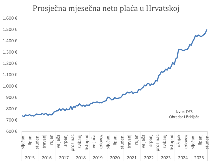 - Plaće s druge strane nastavljaju rasti visokim stopama: prosječna mjesečna neto plaća za studeni 2025. (isplate u prosincu) iznosila je 1.498 eura i u odnosu na isti mjesec prethodne godine nominalno je viša za 9,7%, a realno za 5,7%. Medijalna neto plaća za studeni 2025. iznosila je 1.278 eura i u odnosu na isti mjesec prethodne godine viša je za 10,0%. U zadnjih deset godina, prosječna neto plaća u RH porasla je za malo više od duplo u nominalnim iznosima: s cca 750 eura na cca 1.500 eura.