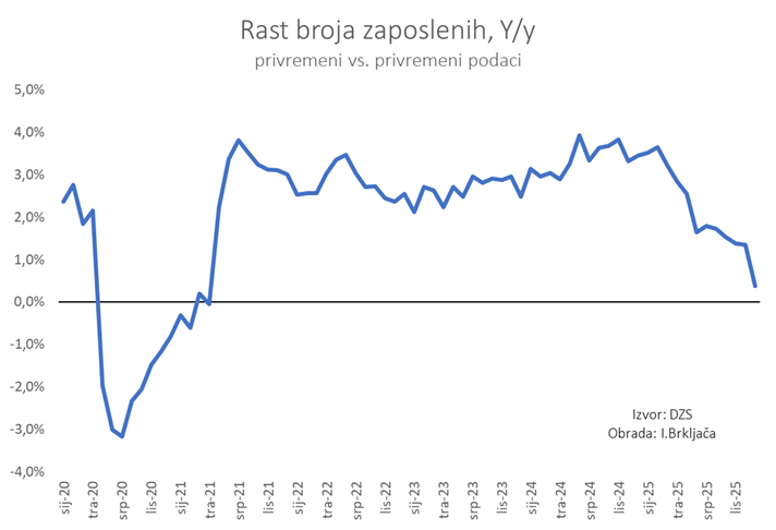 - DZS je objavio kako je u prosincu 2025. broj ukupno zaposlenih u Republici Hrvatskoj iznosio je 1.717.302, te da je u odnosu na isti mjesec prethodne godine broj zaposlenih pao za 1 posto. Kao što sam već više puta pisao, to nije točno; DZS radi metodološku grešku i za sada nema pada broja zaposlenih. No, točno je da broj zaposlenih sve sporije raste i u prosincu je bio samo 0,4% veći nego u prosincu 2024. godine. Ovo će svakako biti jedna od top ekonomskih tema u Hrvatskoj ove godine ako se trend koji vidimo na priloženoj slici nastavi.
