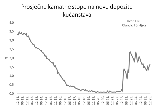 - Prema podacima monetarne statistike, krediti kućanstvima krajem godine iznosili su 27,4 mlrd. eura, što je porast od 13 posto u odnosu na kraj 2024. I dalje najviše rastu stambeni krediti koji su u godinu dana porasli za preko 15 posto. S druge strane, na kraju prosinca 2025. depoziti kućanstava iznosili su 42,3 mlrd. eura, što je 7 posto više nego prije godinu dana. Pri tome su prekonoćni depoziti porasli za 11 posto, dok su se oročeni depoziti smanjili za 6 posto. Dakle, kućanstva uglavnom i dalje „gomilaju“ štednju po tekućim računima; udio oročenih depozita već dulje vremena pada odnosno kućanstva više od tri četvrtine štednje u bankama drže na računima bez oročenja, uz praktički nula posto kamata. Izgleda da im kamatne stope od oko 1,6 posto, koliko trenutačno mogu dobiti na nova oročenja, nisu dovoljno atraktivne da oroče višak štednje.