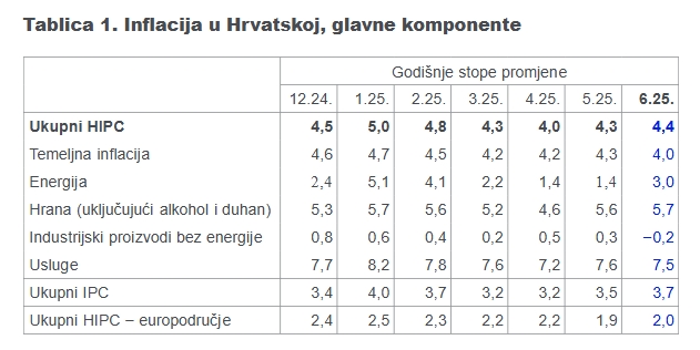 • Ukupna inflacija u Hrvatskoj mjerena harmoniziranim indeksom potrošačkih cijena (HIPC) prema prvoj se procjeni u lipnju 2025. blago ubrzala na 4,4% s 4,3% zabilježenih u svibnju, čemu je najviše pridonijelo izraženo ubrzavanje inflacije cijena energije. Temeljna inflacija (ona koja isključuje cijene energije i hrane) se pak usporila u lipnju, na 4,0% s 4,3% koliko je iznosila u prethodnom mjesecu. Inflacija mjerena nacionalnim indeksom potrošačkih cijena (IPC), koji ne obuhvaća potrošnju stranih gostiju i institucionalnih kućanstava (poput obrazovnih, zdravstvenih, vjerskih institucija i sl.) ubrzala se s 3,5% u svibnju na 3,7% u lipnju. Na mjesečnoj razini (u odnosu na svibanj 2025.), IPC je porastao za 0,3%. Iz priložene tablice vidimo kako su glavni uzroci povišene inflacije u Hrvatskoj i dalje cijene usluga te cijene hrane.
