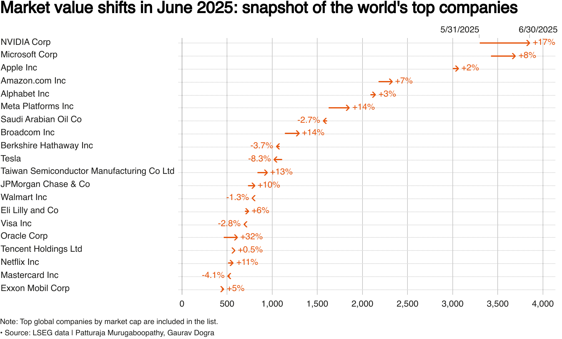 Slika 3. Top 20 kompanija s najvećom tržišnom kapitalizacijom na svijetu te izvedba njihovih dionica u lipnju