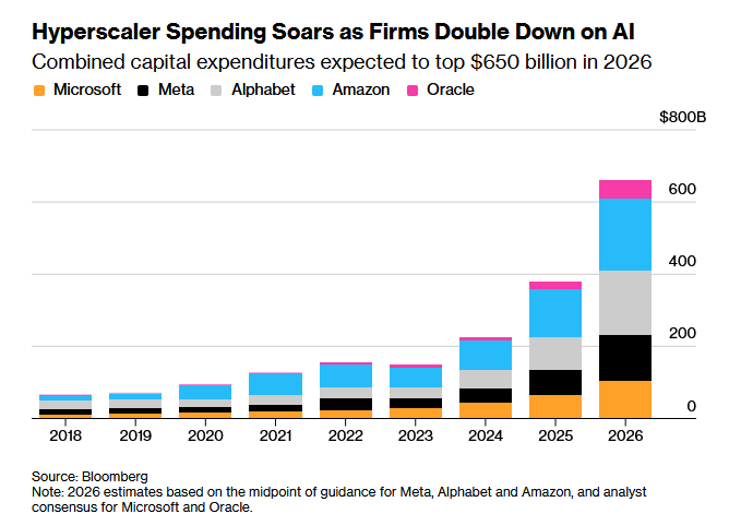 - Pet velikih tehnoloških kompanija (Meta, Amazon, Alphabet, Microsoft i Oracle) ove godine planira uložiti čak 660 milijardi dolara, što je golemi skok u odnosu na prošlu godinu (380 milijardi), koja je pak bila rekordna u svakom pogledu. No, sada se CAPEX počinje i sve više financirati zaduženjima: Morgan Stanley procjenjuje da će hyperscaleri ove godine posuditi čak 400 milijardi dolara. To je znatno više nego prošle godine (165 milijardi), a tako velika ponuda obveznica, kažu, mogla bi dovesti do širenja kreditnih spreadova.