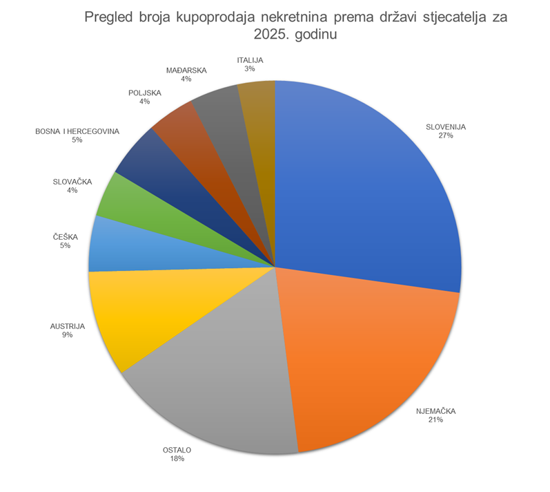 - Porezna uprava je objavila podatke o broju kupoprodaja nekretnina za 2025. Ispada da je u Hrvatskoj prošle godine realizirano ukupno 117.359 kupoprodaja nekretnina, što je za 17,8 tisuća ili 13,2 posto manje u odnosu na godinu ranije. Mediji su to uglavnom prenijeli kao fakt tj. činjenicu da se definitivno radi o „snažnom padu prodaje nekretnina“. Međutim, iz same PU nekoliko puta ističu dvije napomene: „ Navedeni pregled ne sadrži podatke o ukupnoj kupoprodaji nekretnina, već isključivo o kupoprodaji za koje je Porezna uprava provela postupak utvrđivanja porezne osnovice. 2. U Informacijskom sustavu Porezne uprave još uvijek traje postupak ažuriranja podataka o kupoprodajama te su dostavljeni podaci podložni promjenama i ne smatraju se konačnim.“ Dakle, niti su podaci konačni, niti uključuju sve kupoprodaje, tako da ne možemo sa sigurnošću znati da je uistinu došlo do takvog pada realiziranih transakcija. Recimo, malo čudno zvuči podatak da je prošle godine prodano najmanje stanova i kuća još od 2017., zar ne? Manje nego i u lockdownom obilježenoj 2020. godini?! U prilog tezi da se radi o mogućem šumu u podacima piše Nenad Bakić koji, među ostalim argumentima, ističe i neobičnu činjenicu da je baš u svim kategorijama (vrstama nekretnina) zabilježen pad u 2025., pa čak i veliki pad prodaje grobnih mjesta, šuma, livada, garaža, parkirnih mjesta itd. Uglavnom, valja pričekati nove podatke prije nego budemo sigurni da je uistinu došlo do takvog pada potražnje. Na kraju još samo pokažimo tko od stranaca najviše kupuje nekretnine u Hrvatskoj (jer ovi se omjeri ne mijenjaju značajno kroz godine, a udjel stranih kupaca u ukupnim transakcijama se obično kreće između 8 i 10 posto).
