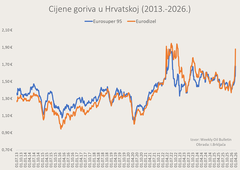• Vlada priprema dodatne mjere za ublažavanje rasta cijena goriva i plina, poručio je premijer Andrej Plenković. Carinska uprava je od Europske komisije zatražila dopuštenje za zadiranje u europski dio trošarina (minimalne trošarine u EU iznose 0,359 eura po litri benzina, i 0,33 eura po litri dizela), što bi otvorilo dodatni prostor za snižavanje cijena. Odluka Bruxellesa očekuje se idućih dana, a premijer smatra da bi takva mjera trebala biti dostupna svim članicama EU-a. Istodobno, Vlada je u javno savjetovanje uputila izmjene Zakona o PDV-u koje bi joj omogućile da u izvanrednim okolnostima, svaka dva tjedna intervenira i u stopu PDV-a na energente kako bi dodatno ublažila rast cijena. Iako bi izmjene mogle biti usvojene do kraja travnja, Plenković naglašava da se taj alat uvodi preventivno i da će se koristiti samo ako to doista bude nužno, ovisno o daljnjem kretanju cijena energenata. A kako su se povijesno kretale cijene dizela i benzina na hrvatskim crpkama, možete vidjeti na priloženom grafikonu (u Tjednom biltenu o nafti Europske komisije podaci su dostupni od ulaska Hrvatske u EU). Na grafikonu možemo vidjeti kako su cijene najviše bile u ljeto 2022., nekoliko mjeseci nakon napada Rusije na Ukrajinu. Najviša prosječna cijena benzina u Hrvatskoj tako je iznosila 1,87 €/l (početkom lipnja 2022.), a dizela 1,95 €/l (srpanj 2022.). Cijena litre dizela danas se sasvim približila tim rekordnim razinama te iznosi 1,87 €/l, dok je litra benzina danas 1,68 €/l odnosno još uvijek je 19 centi niža od rekordne razine iz 2022.