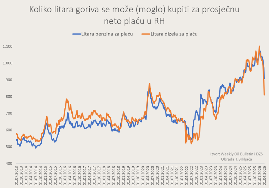 • Međutim, kada usporedimo kretanje cijene dizela i benzina na crpkama s prosječnom neto plaćom u Hrvatskoj, dobijemo sasvim drukčiji izgled grafikona. Na grafikonu 2 prikazana je kupovna moć prosječne neto plaće iskazane u litrama dizela ili benzina. Zgodno je primijetiti i da iako se današnje cijene na benzinskim crpkama približavaju onima iz 2022., danas možemo kupiti puno više goriva za prosječnu plaću – jer su plaće porasle za cca 50 posto u zadnje 4 godine. Najviše litara goriva s jednom prosječnom plaćom mogli smo kupiti krajem 2025.: oko 1.100 litara i benzina i dizela. Najmanje litara goriva s jednom prosječnom plaćom mogli smo kupiti u ljeto 2022.: svega oko 550 litara. Danas s jednom prosječnom plaćom možemo kupiti oko 815 litara dizela i preko 900 litara benzina.
