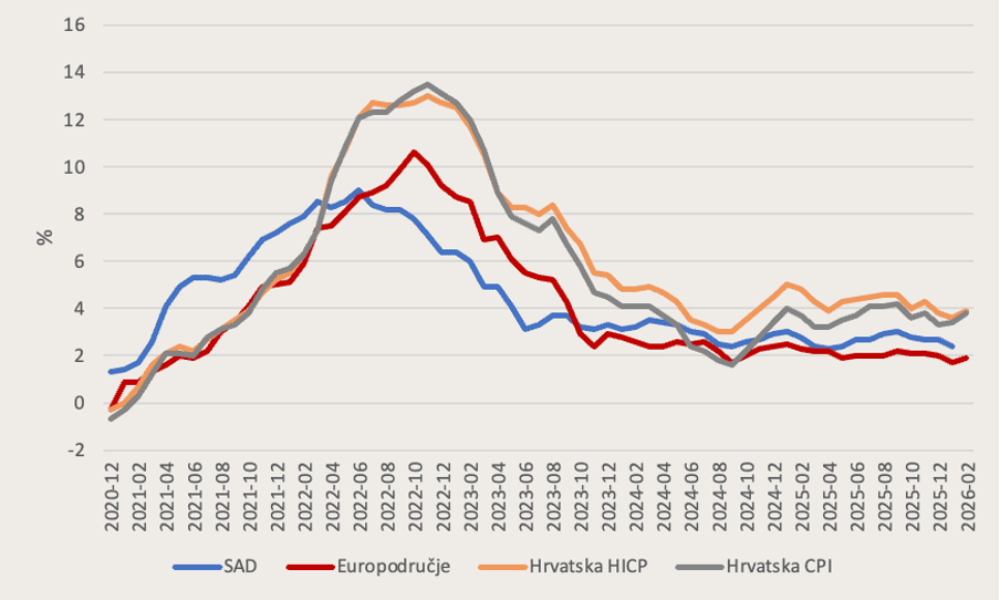 Prvo o “predratnoj” inflaciji: veliki dio razlike između (niske) inflacije u europodručju (1,9% u veljači) i (visoke) inflacije u Hrvatskoj (3,8%) može se objasniti razlikom u kretanju cijena energenata za kućanstva. U europodručju gdje cijene energije za kućanstva u prosjeku slijede tržišna kretanja uže nego u Hrvatskoj, trošak energenata za kućanstva bilježi pad za 3,2% (veljača 2026. u odnosu na veljaču 2025.). U Hrvatskoj, gdje su ove cijene jače regulirane, prilagodba cijena ukidanjem subvencija i restrikcija krenula je kasnije. Zbog toga su cijene energenata za kućanstva u veljači bile za 4,3% veće nego u veljači prošle godine kada su još bile obilno subvencionirane i regulirane, što je bio svojevrsni zaostatak iz prethodnog inflacijskog ciklusa.