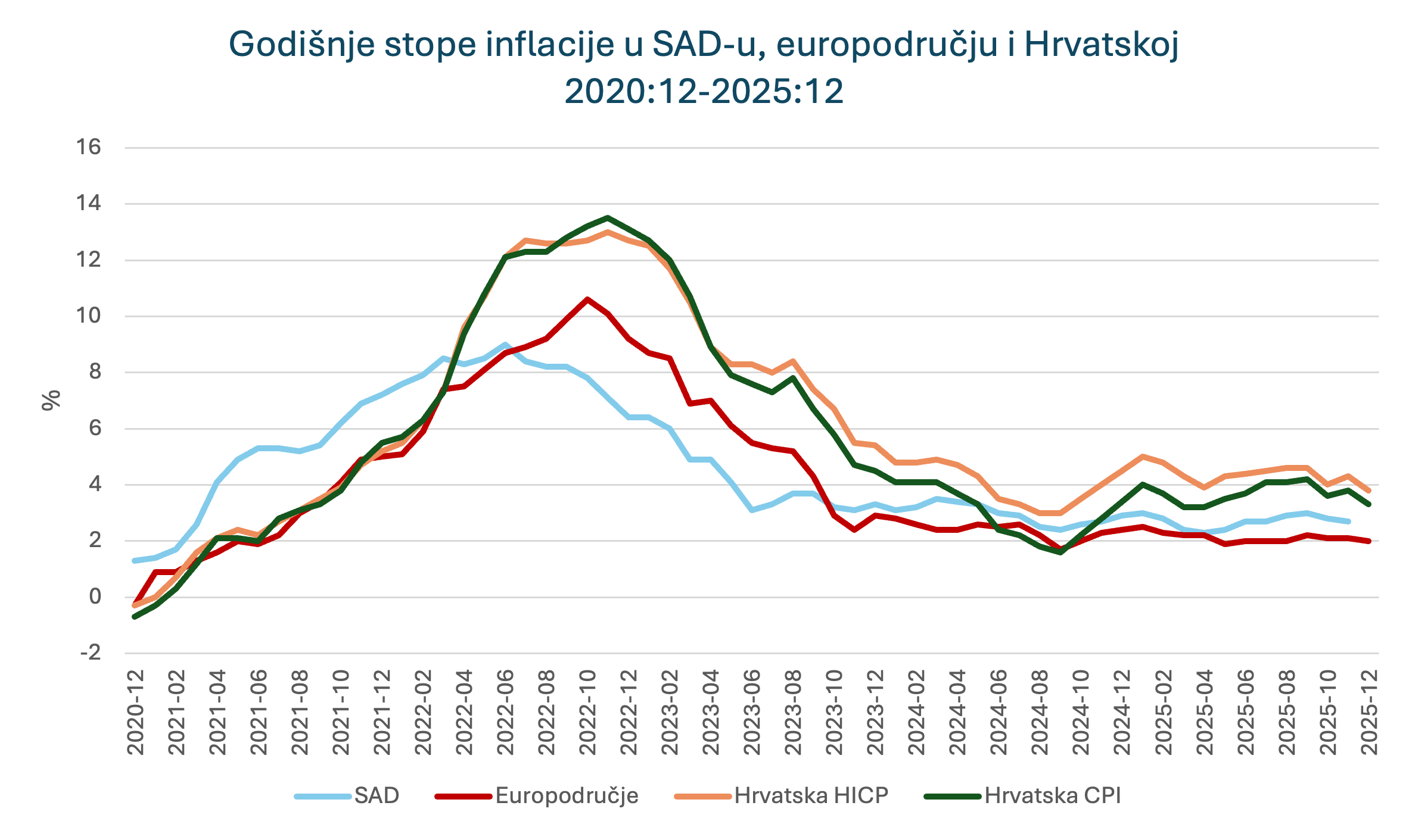 *Imputirana inflacija u SAD-u za listopad kada nije objavljena zbog zatvaranja vladinih službi; CPI – potrošačke cijene prema domaćim ponderima u košarici dobara, HICP – Eurostatovi ponderi koji uključuju potrošnju svih građana EU u Hrvatskoj (veći udjel turističkih usluga).